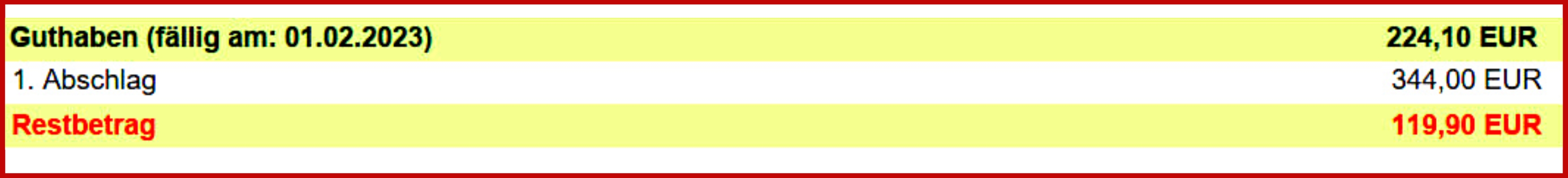 Dann sehen Sie, ob Sie Geld zurückbekommen, weil Sie Energie gespart oder von vornherein einen höheren monatlichen Abschlag gewählt haben oder, ob Sie eine Nachzahlung auf Ihrer Rechnung finden.